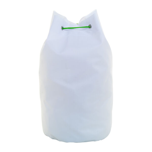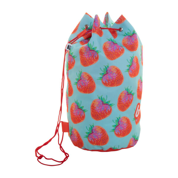 Custom made sailortas met trekkoord van 600D RPET polyester, met gekleurde koorden. Met all-over sublimatie bedrukking en onderscheidend RPET-label. MOQ: 25 stuks.